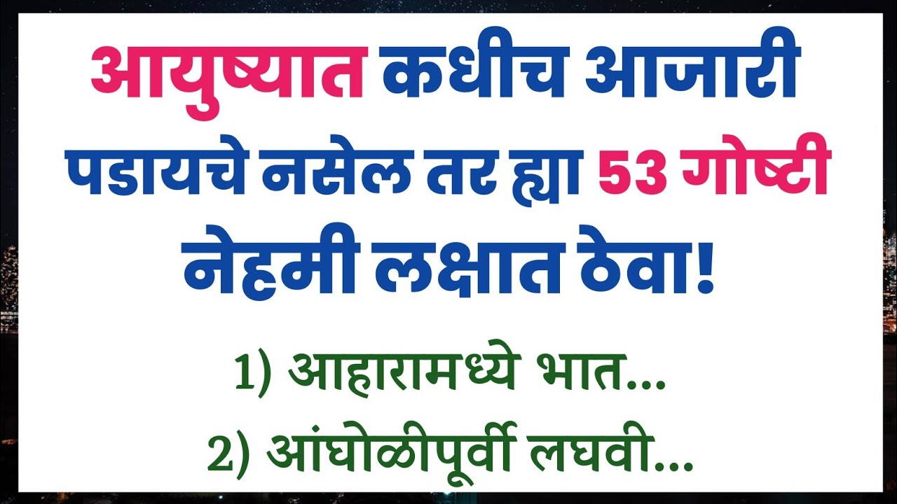 आयुष्यात कधीच आजारी पडायचे नसेल तर ह्या 53 गोष्टी नेहमी लक्षात ठेवा 😎 | 53 Health Tips in marathi by admin February 24, 2026 6 Check on YouTube healthy lifestyle tips FacebookTwitterPinterestEmail You may also like I Tried 75 Hard…and it changed my life March 1, 2026 🔥முதல் 90 நிமிடங்கள்🔥 | Perfect Morning Routine For... February 28, 2026 Hormonal Imbalance Ka Ilaj | Healthy Lifestyle Tips... February 27, 2026 Daily Routine, Kanji Recipe, Cooking, Grocery | Healthy... February 26, 2026 How To Maintain Your Health After 40 Years... February 25, 2026 Aging well: my journey to a healthier lifestyle... February 23, 2026 The Secrets and Science of Mental Toughness |... February 22, 2026 7 Signs of Gut Damage You’re Probably Ignoring... February 21, 2026 Allison Janney’s Wellness Tips and Tricks Fit For... February 20, 2026 Top 40 amazing health tips/rules for healthy life/healthy... February 19, 2026